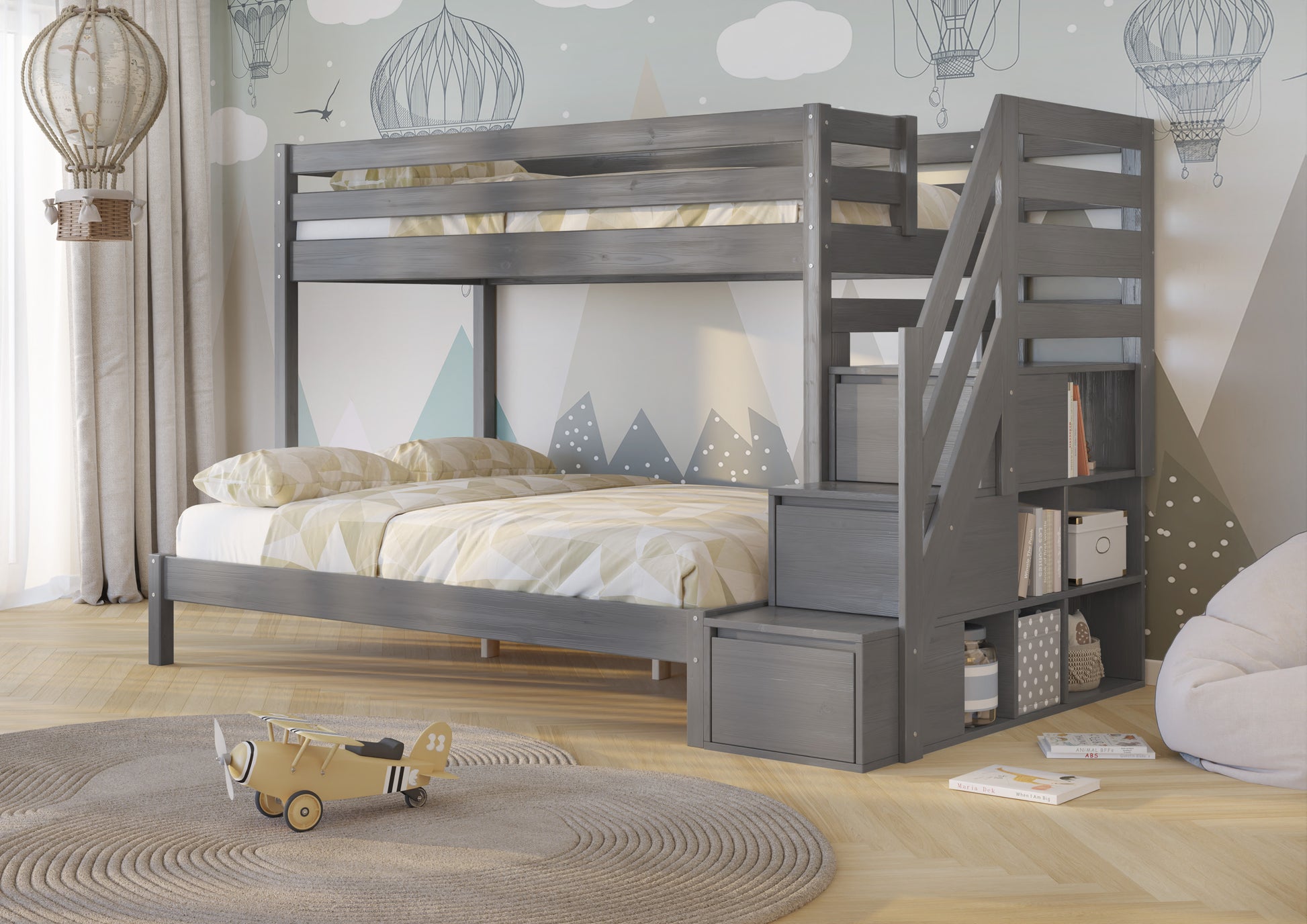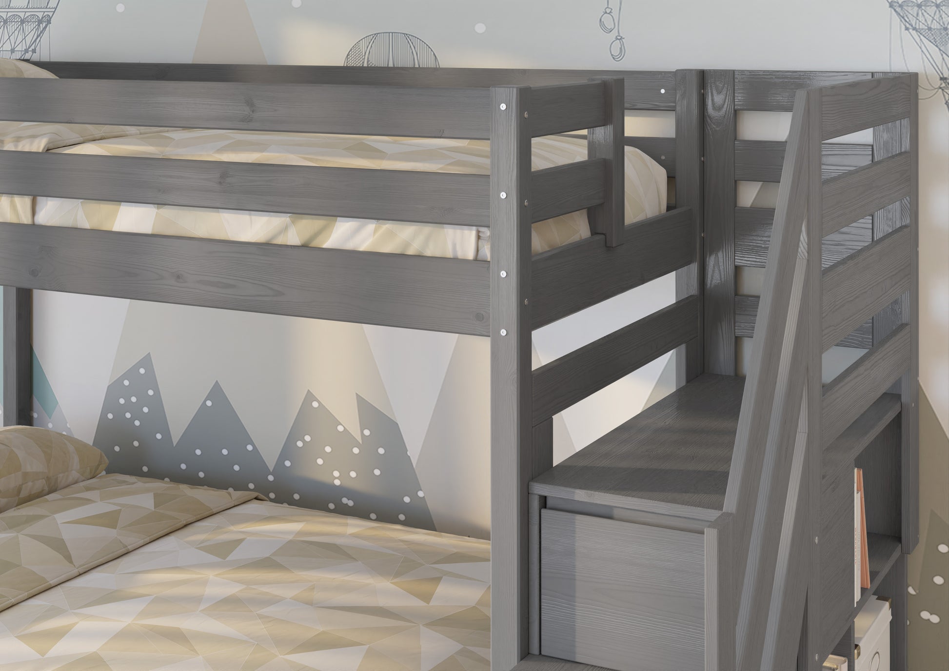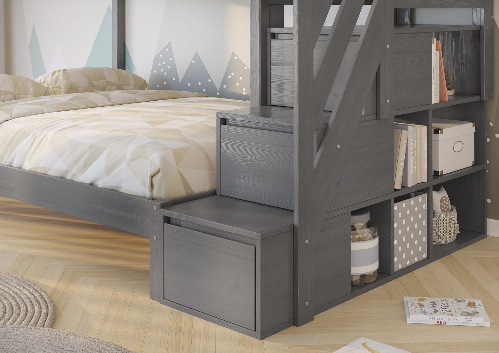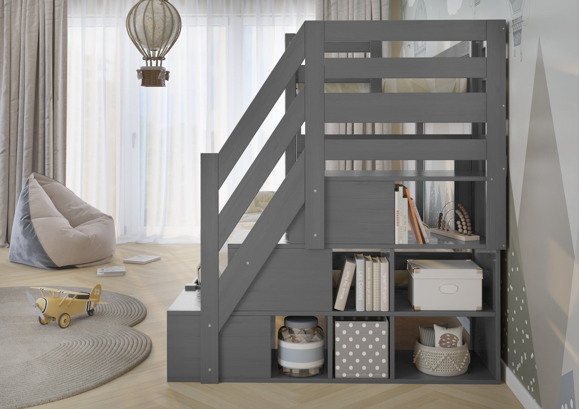 Sengen er lavet af 100% massivt fyrretræ, omhyggeligt forarbejdet af erfarne tømrere – helt uden MDF og uden at gå på kompromis med kvaliteten. De massive trappetrin har indbyggede skuffer og hylder, som giver masser af smart opbevaringsplads til legetøj, bøger eller tøj.
